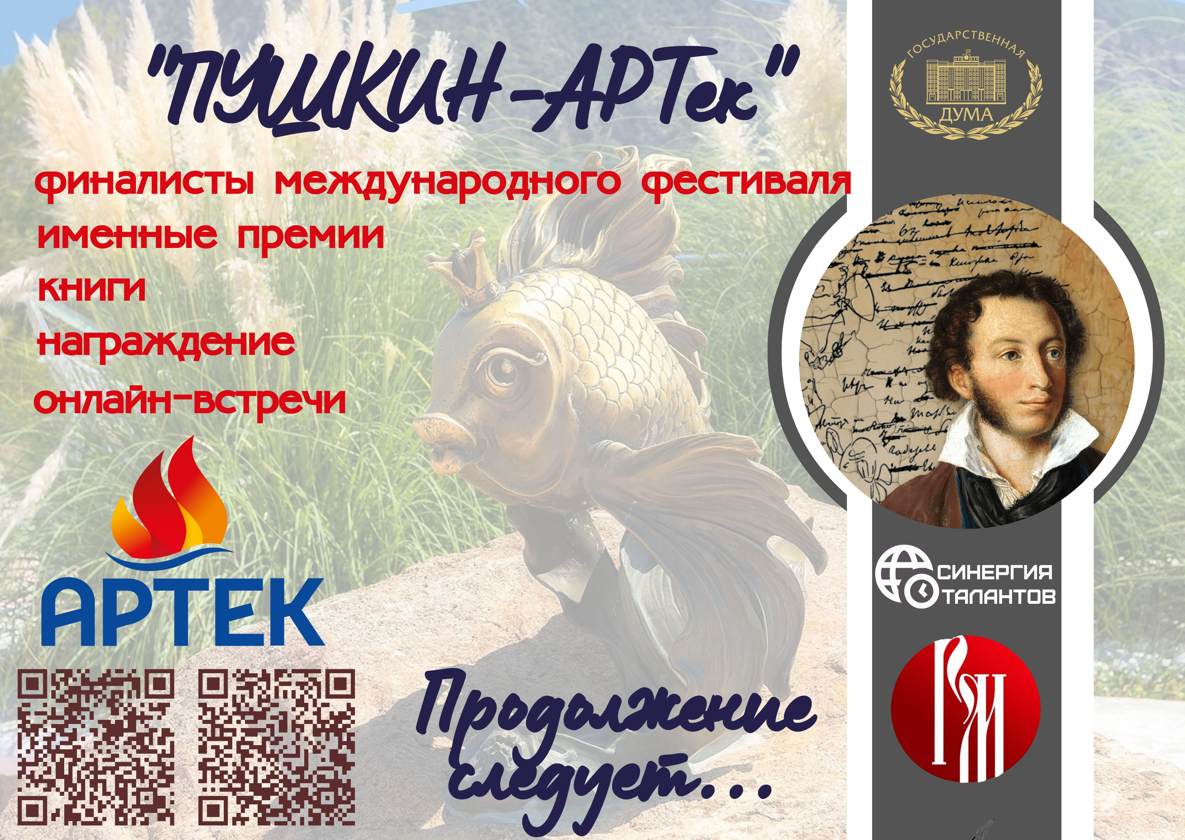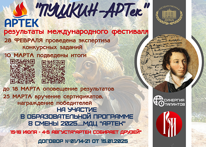 «Международный фестиваль «Пушкин-АРТек», приуроченный к празднованию 225-летия со Дня рождения А.С. Пушкина (Указ Президента РФ № 404 от 05.07.2021) и написанию третьего тома книги «Диалог с Пушкиным», распространяемую в 100 странах мира. Награждение путевками на образовательную программу смены 8 смены 2025 года в МДЦ «Артек» за победу в ежегодном конкурсе «Пушкин-АРТек» осуществляется в соответствии с учетом норм и требований в области санитарно-эпидемиологического благополучия населения Российской Федерации, а также стран ближнего и дальнего зарубежья — победителей конкурса.