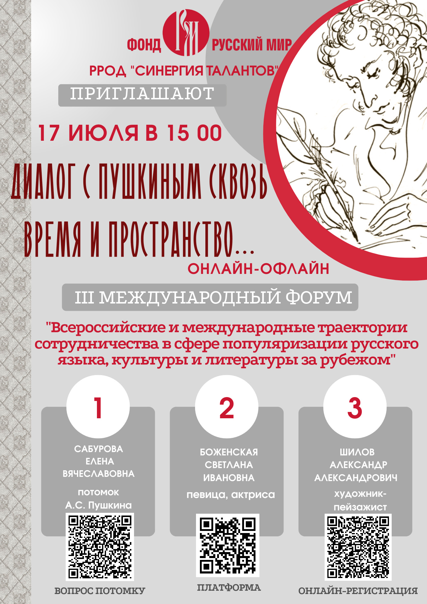 17 июля в фонде "Русский мир" состоялся III Международный форум "Всероссийские и международные траектории сотрудничества в сфере популяризации русского языка, культуры и литературы за рубежом" организованный в рамках международного проекта "Диалог с Пушкиным сквозь время и пространство".